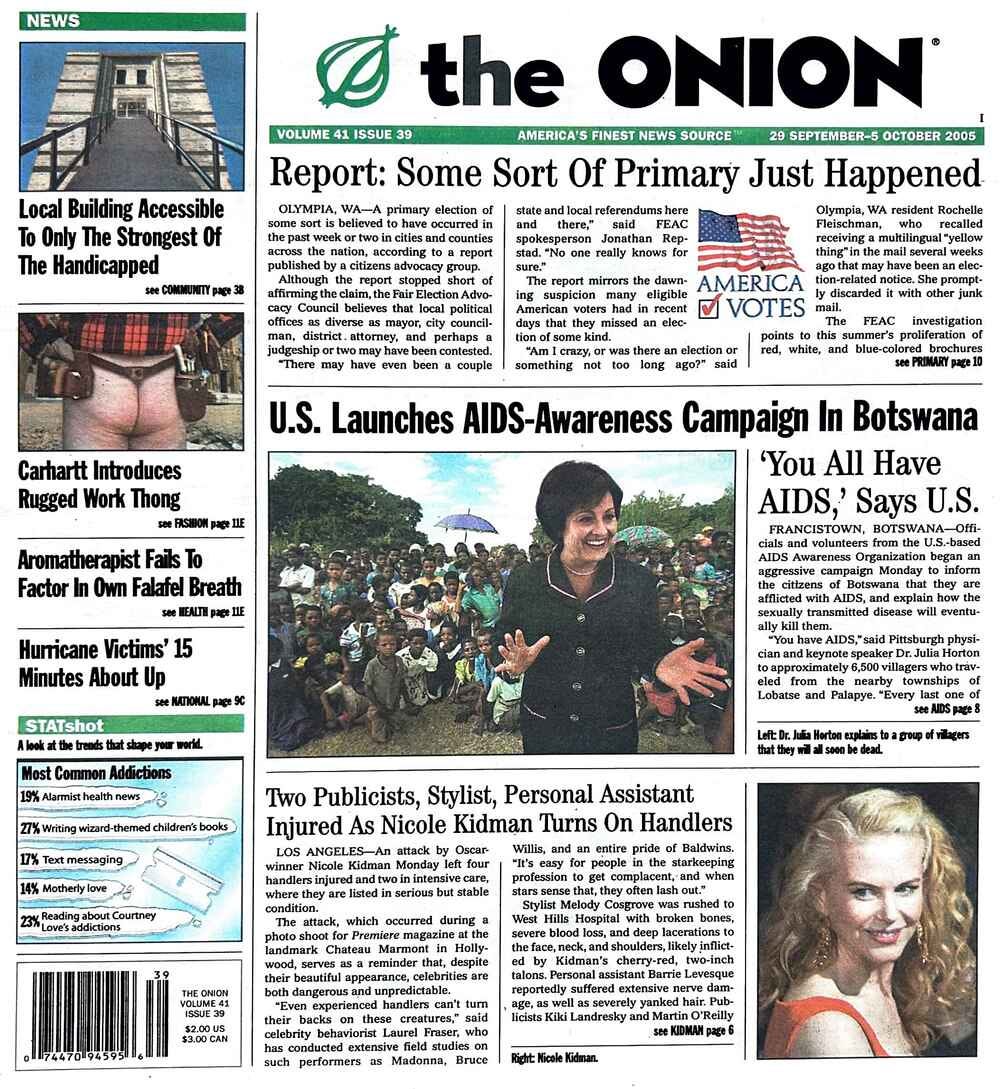 What did The Onion do? They ignored Bush and invented a ghoulish nonprofit called the AIDS Awareness Organization (AAO).